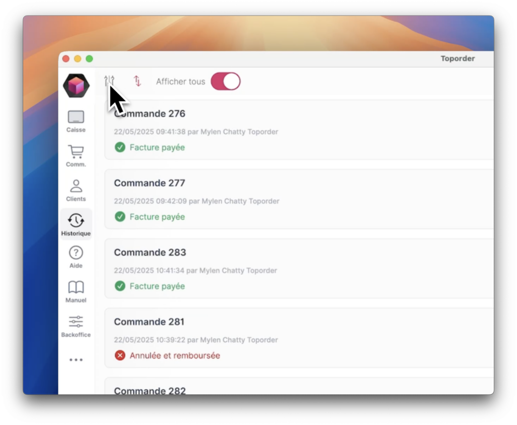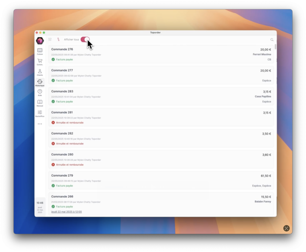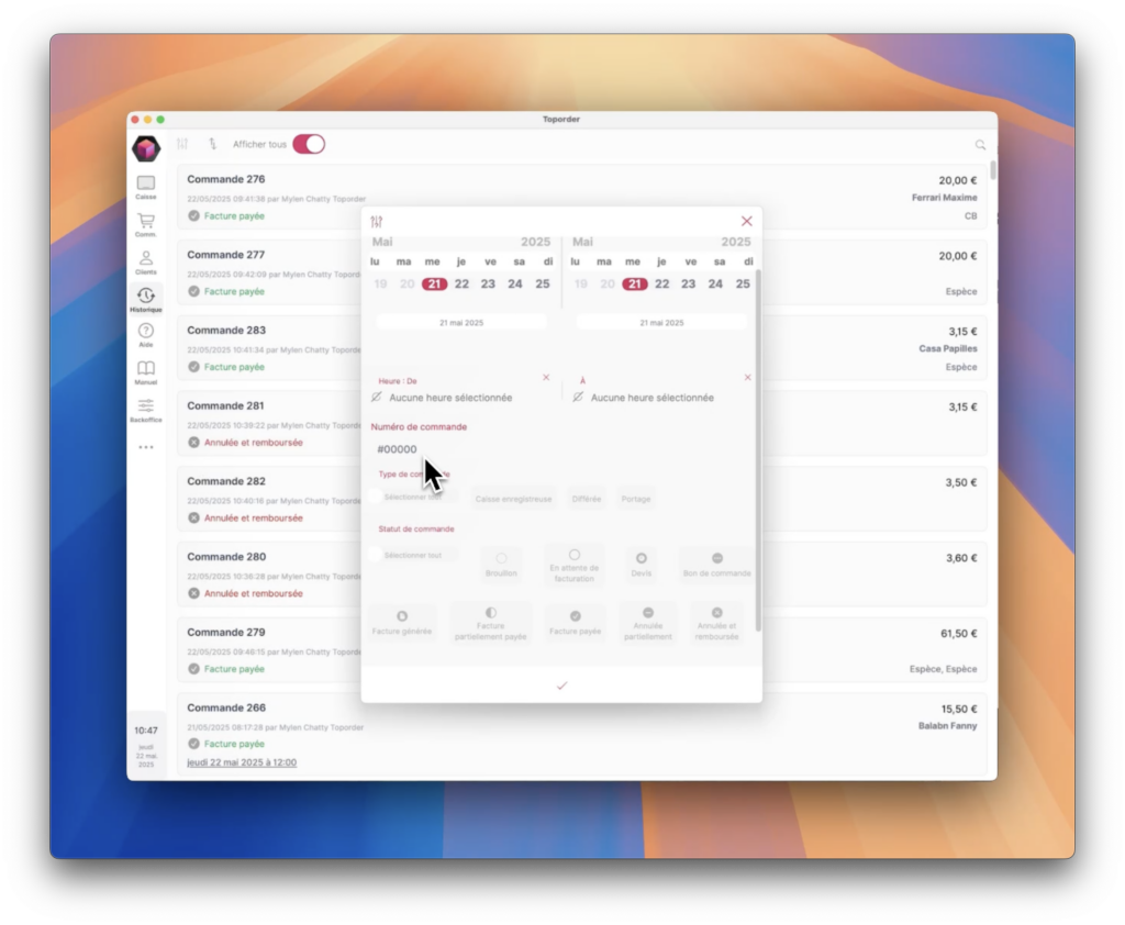 Les tickets du jour ou d’autres périodes sont affichés selon les filtres choisis.