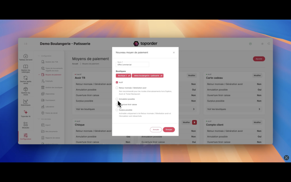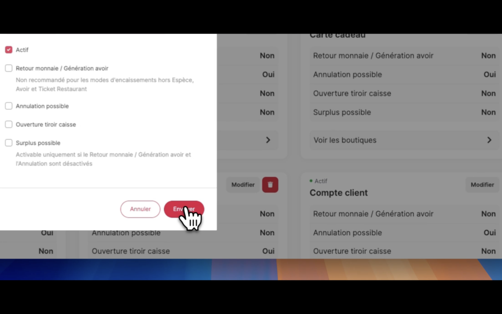 1. Configurer les options : retour monnaie, génération d’avoir, annulation possible, ouverture du tiroir-caisse, surplus autorisé.