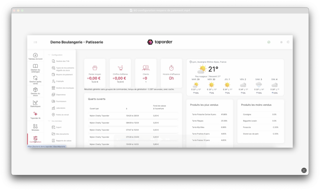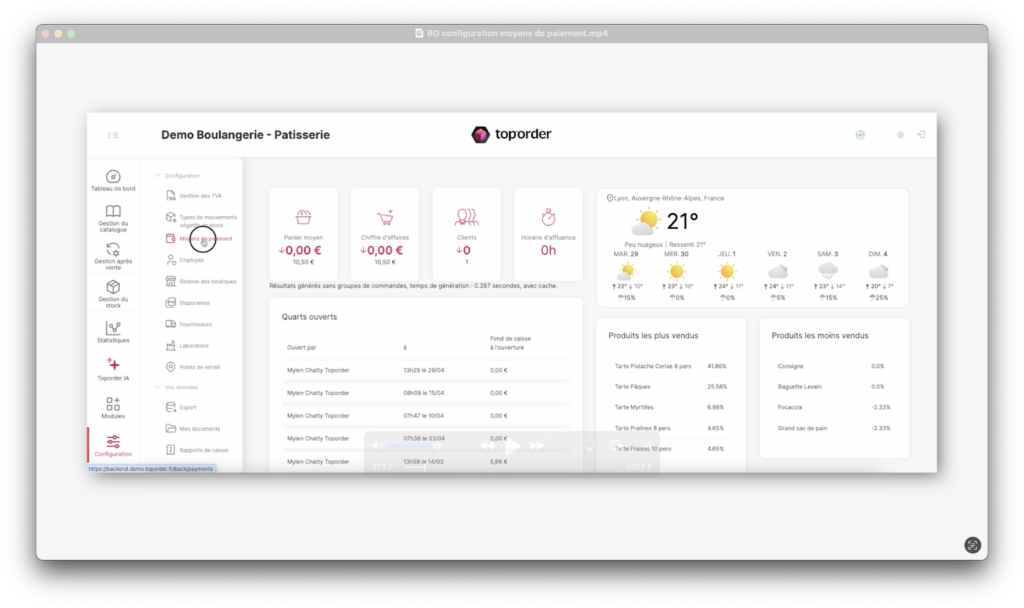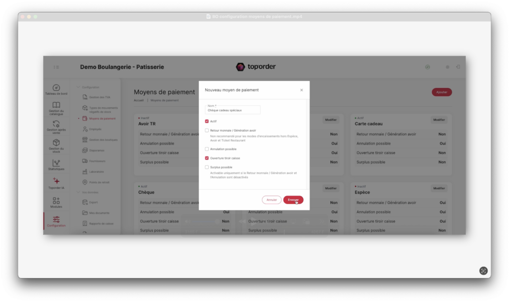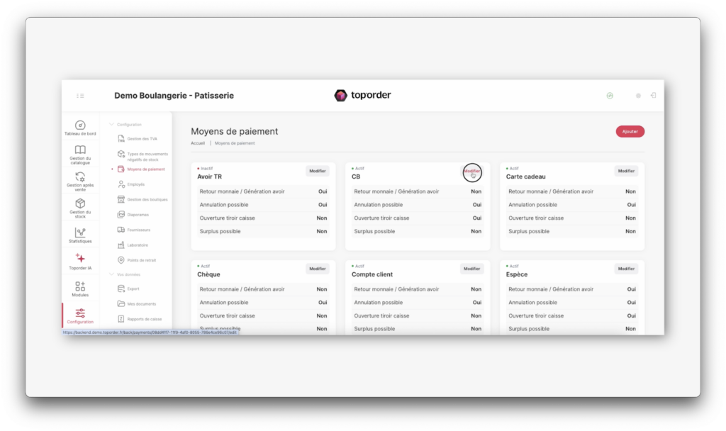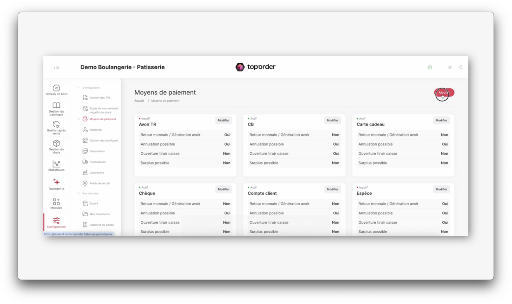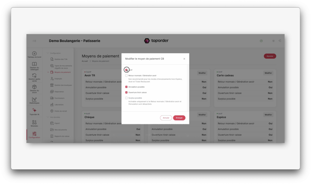 Les moyens de paiement actifs apparaissent sur la caisse conformément aux réglages.