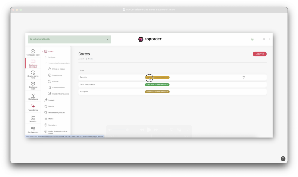 La nouvelle carte de produits est créée et, si choisi, définie comme carte par défaut.