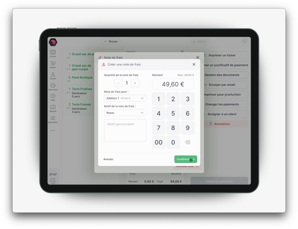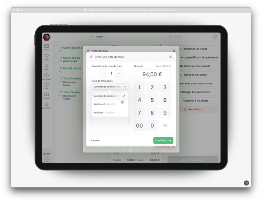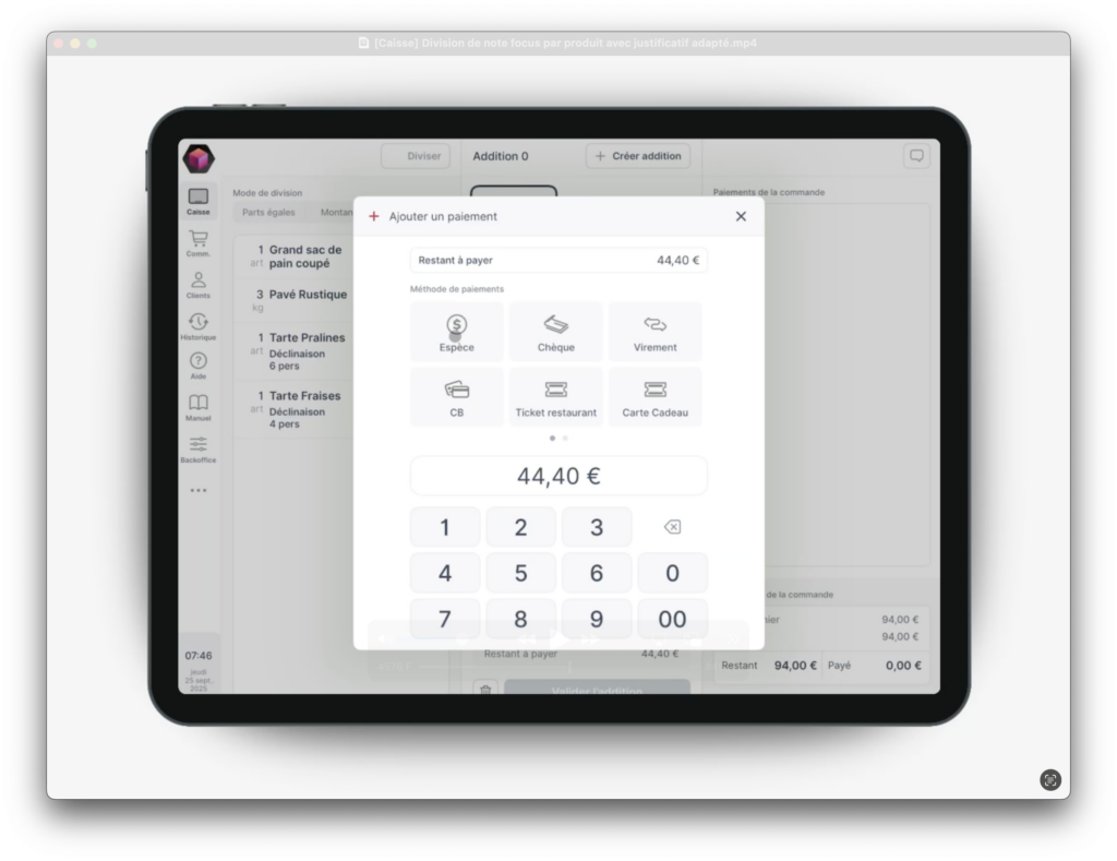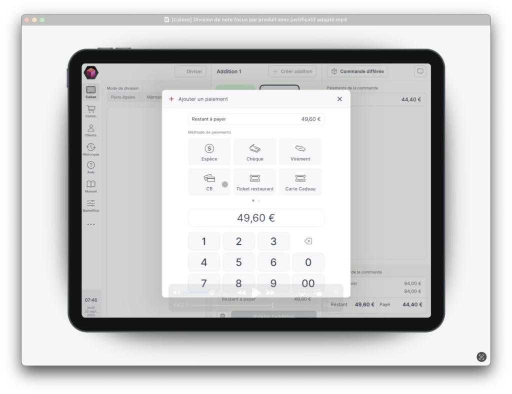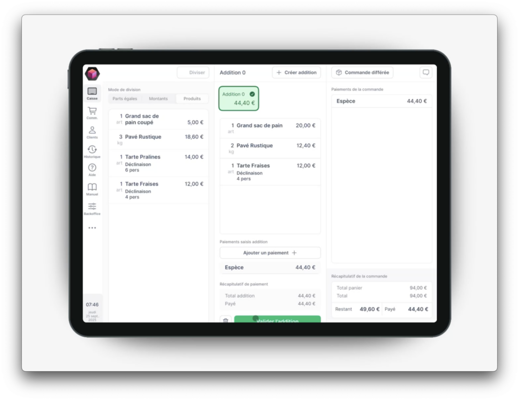 1. Valider la première addition et encaisser selon le moyen choisi (ex. espèces).