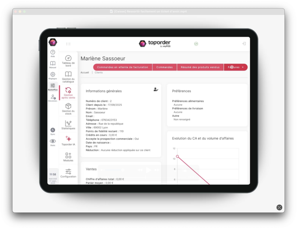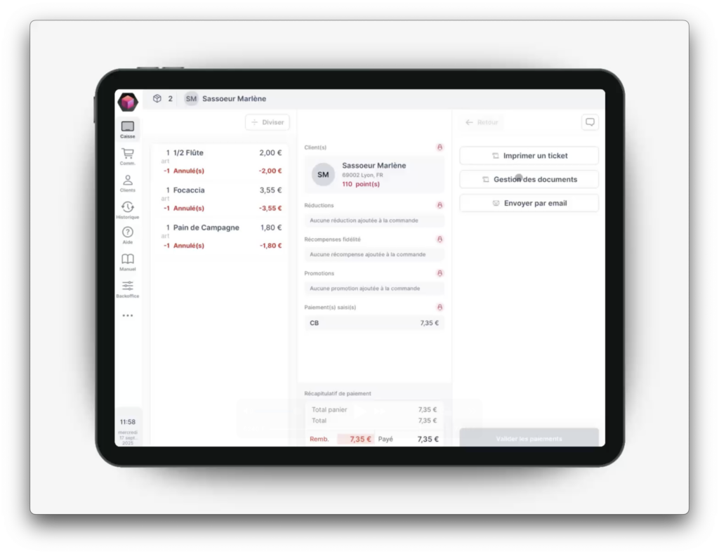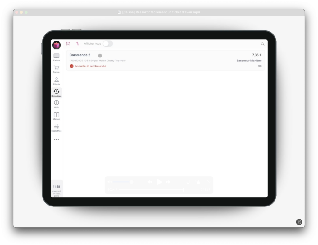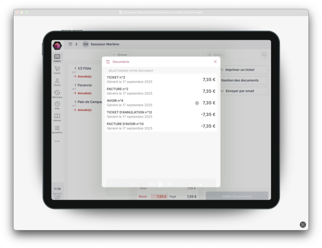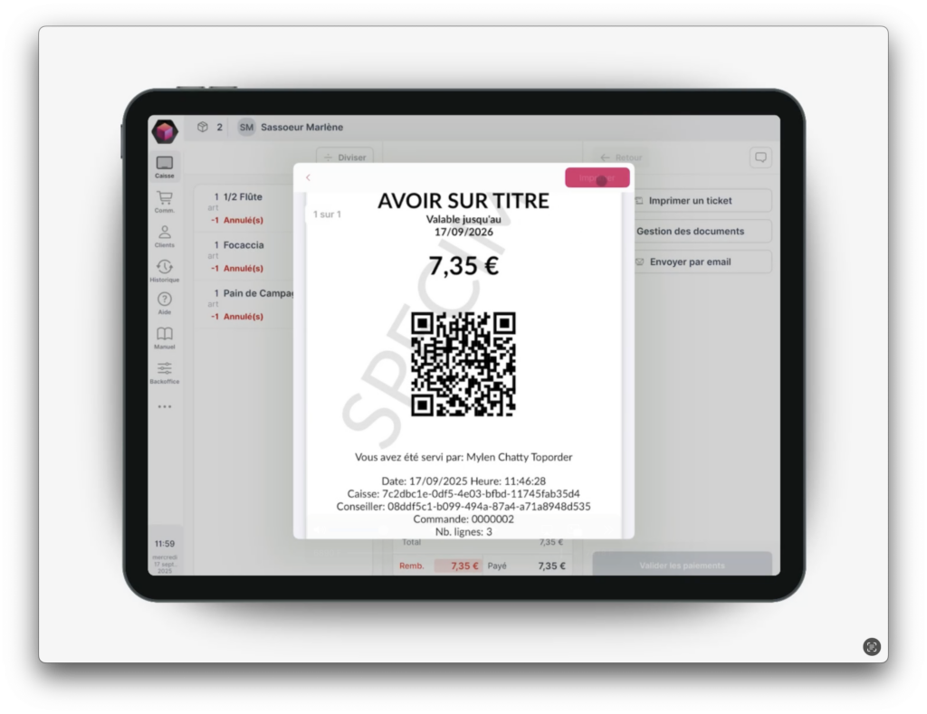 Le ticket d’avoir est retrouvé et réimprimé pour le client.