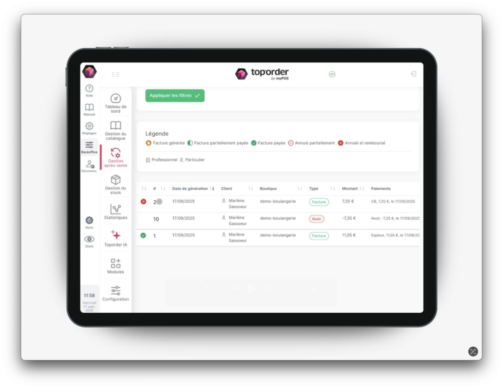 1. Ouvrir la section Factures et identifier la facture d’avoir.
